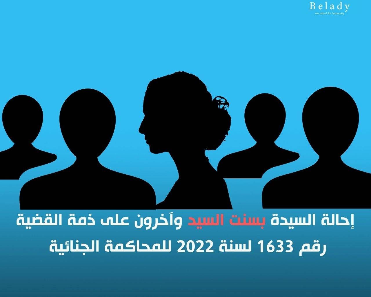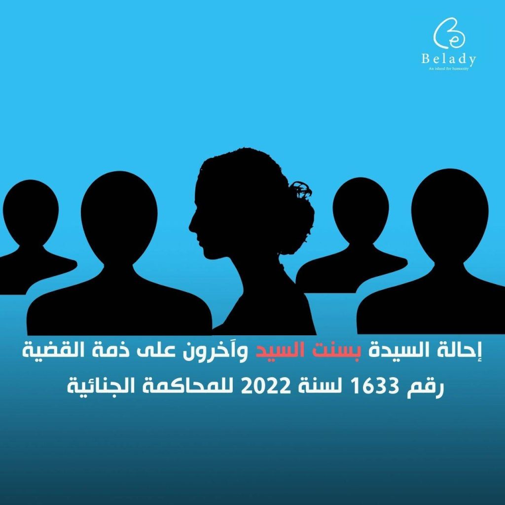 بتاريخ أول أمس الموافق 18 نوفمبر 2024، وقّعت السّيدة بسنت السيد حامد محمد على أمر إحالتها للمحاكمة الجنائية، وكافة المتهمين المدرجين على ذمة القضية رقم 1633 لسنة 2022 حصر أمن الدولة العليا، وذلك بعد اتهامهم/هن جميعاً بتهمة الانضمام لجماعةٍ إرهابية.