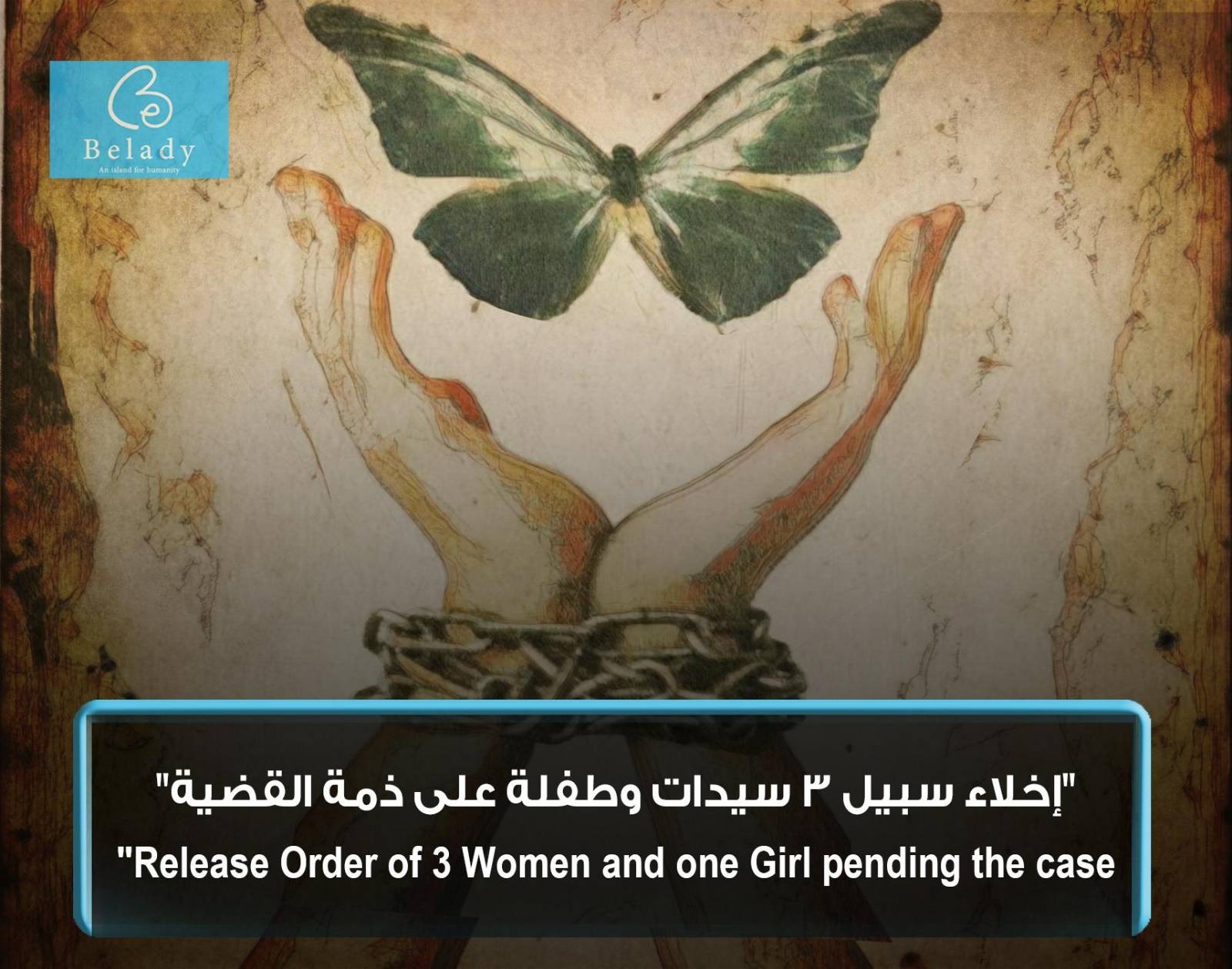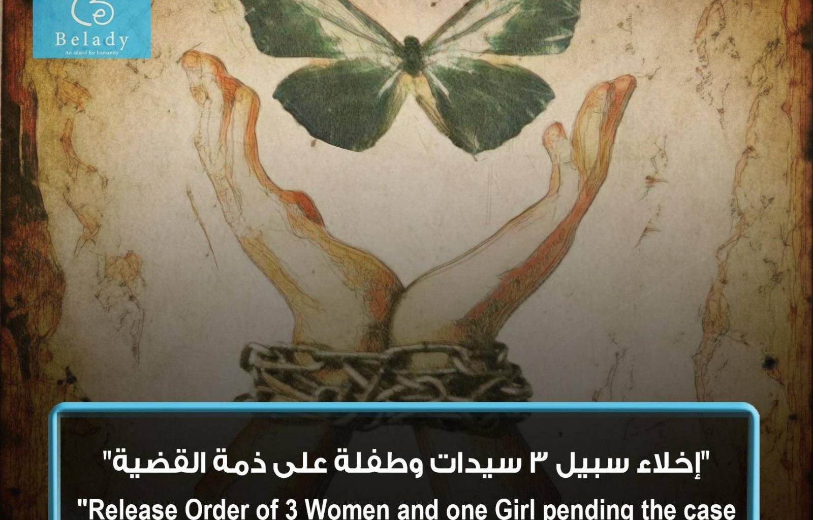 تسعد بلادي بقرار محكمة إخلاء سبيل (1) ايمان سعيد حميدان، (2) رباب جمعة محمد، (3) مليحة سلمى مرشود، (4) والطفلة: هدى عبد الرحمن علي، بضمان محال إقامتهنّ على ذمة القضية رقم 1935 لسنة 2021 حصر أمن الدولة العليا.
