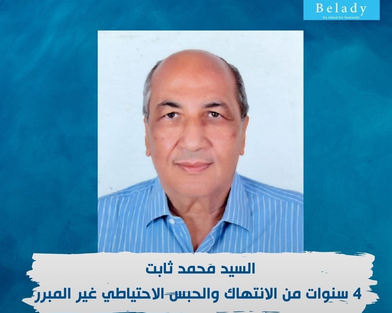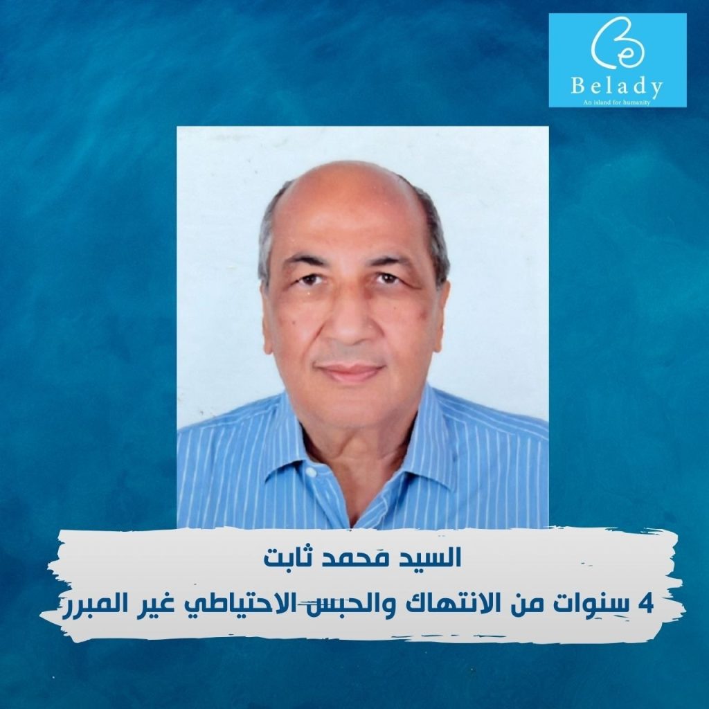 السيد/ محمد أحمد حسن ثابت، أحد المسنين الذين ينكل بهم النّظام المصري، حيث يبلغ من العمر 73 عاماً قضى منهم في السجن أكثر من 4 سنوات ونصف قيد الحبس الاحتياطي دون أي سند قانوني.