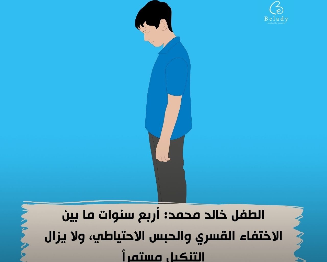 تطالب بلادي بضرورة الإفراج عن الطفل خالد محمد، وتلقيه الرعاية الصحية والنفسية المناسبة لمثل حالته، وضرورة عودته لأسرته، ومحاسبة المسؤولين عن التنكيل به على هذا النحو.