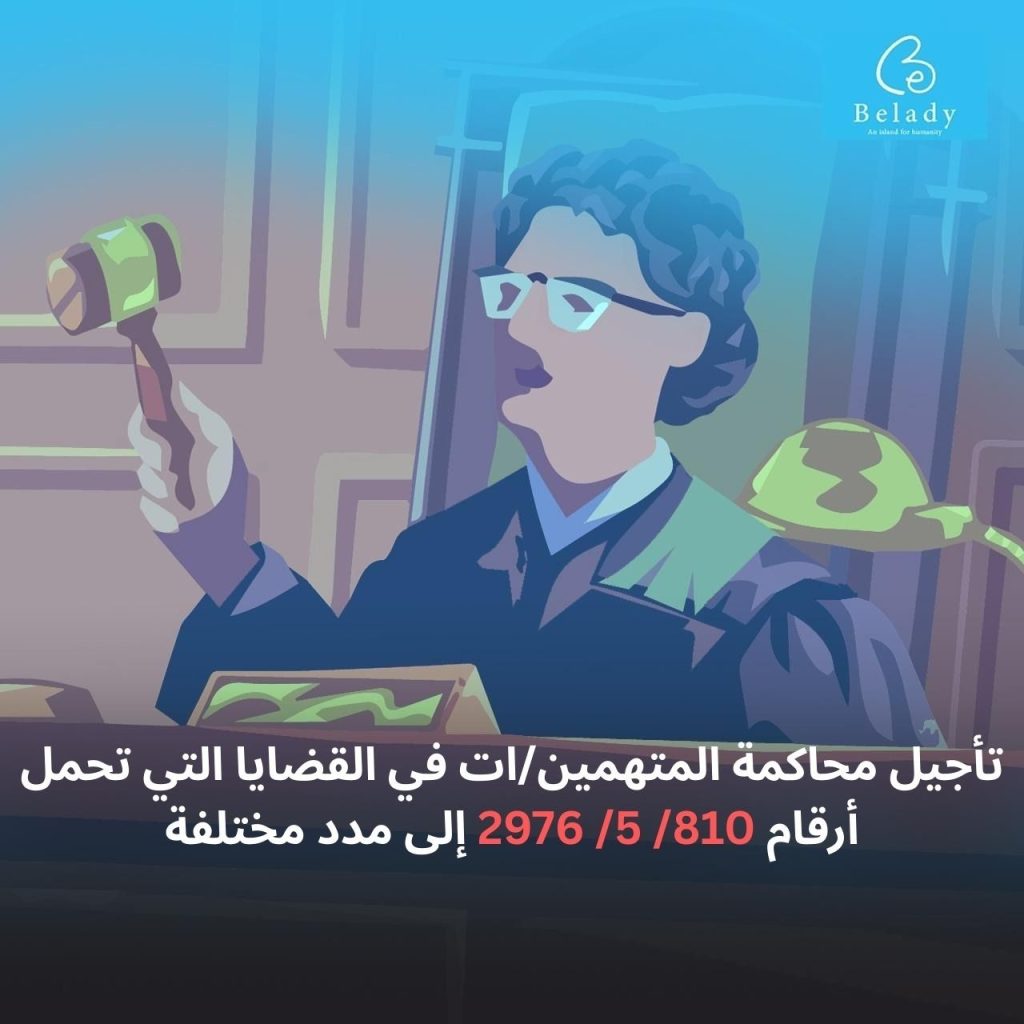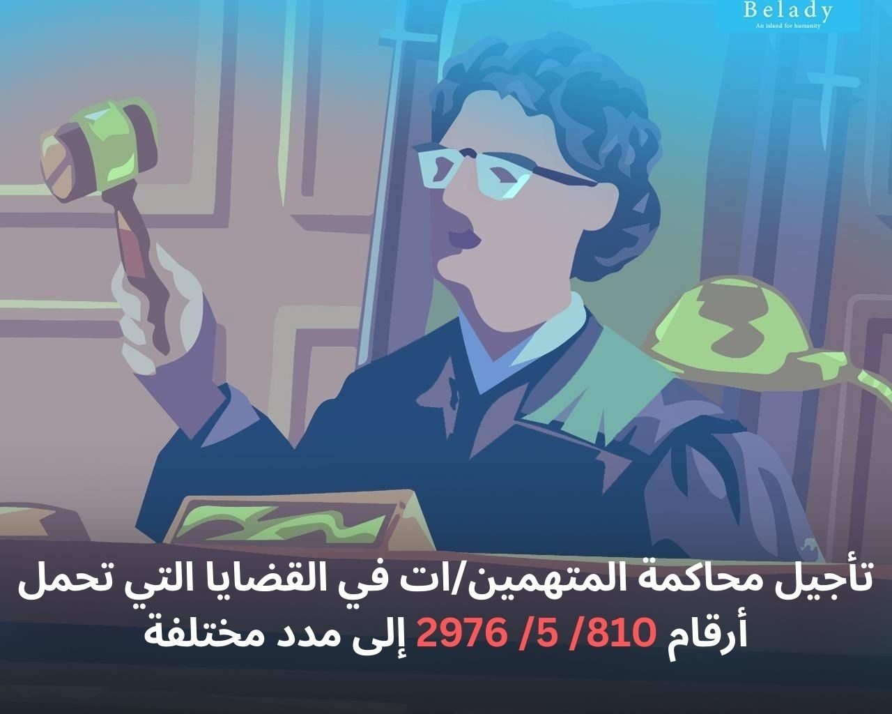 أيضاً قررت تأجيل محاكمة المتهمين/ات، في القضية رقم 2976 لسنة 2021 حصر أمن الدولة العليا، والمعروفة إعلامياً بـ”جروب مطبخنا”، إلى يوم السبت الموافق 11 أكتوبر 2025.