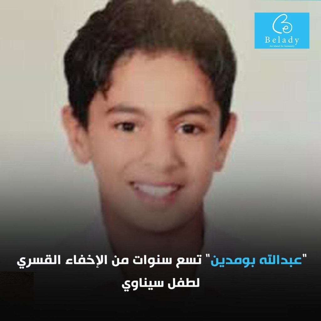 منذ 31 ديسمبر 2017، يتعرض الطفل السيناوي عبدالله بومدين نصر الدين عكاشة لجريمة إخفاء قسري متواصلة، تمثل واحدة من أخطر أنماط الانتهاك الممنهج لحقوق الأطفال في مصر.في ذلك اليوم، اقتحمت قوة من الأمن الوطني مدعومة بقوات من الجيش منزل الأسرة في مدينة العريش، وألقت القبض على الطفل عبدالله، الذي لم يكن قد تجاوز الثانية عشرة من عمره، دون إذن قضائي، ومن بين ذراعي والدته، وذلك بعد أيام من القبض على والده الذي لا يزال مختفيًا قسريًا منذ لحظة القبض عليه وحتى اليوم، في مخالفة صريحة للدستور المصري وقواعد الحماية الخاصة بالأطفال.