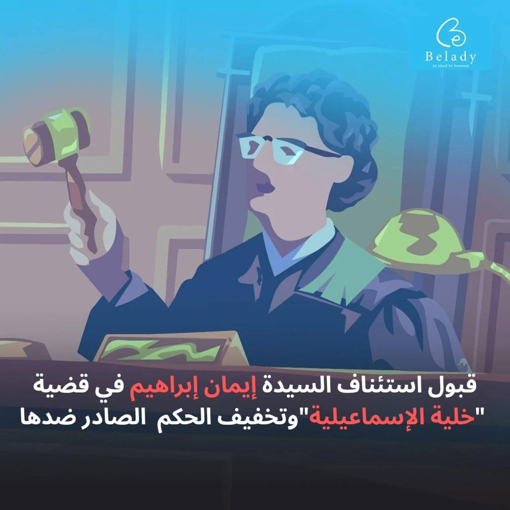 بتاريخ 13 يوليو 2025، قضت محكمة جنايات مستأنف إرهاب، المنعقدة بمجمع محاكم بدر، برئاسة القاضي “حمادة الصاوي”، بقبول استئناف السيدة “إيمان إبراهيم سليمان سليم”، وتخفيف الحكم الصادر ضدها من السجن المؤبد إلى السجن المشدد لمدة 15 عاماً. وذلك في القضية رقم 240 لسنة 2021 حصر أمن الدولة العليا، والمقيدة برقم 2482 لسنة 2022 جنايات الشروق، والمعروفة إعلامياً بـ”خلية الإسماعيلية”.