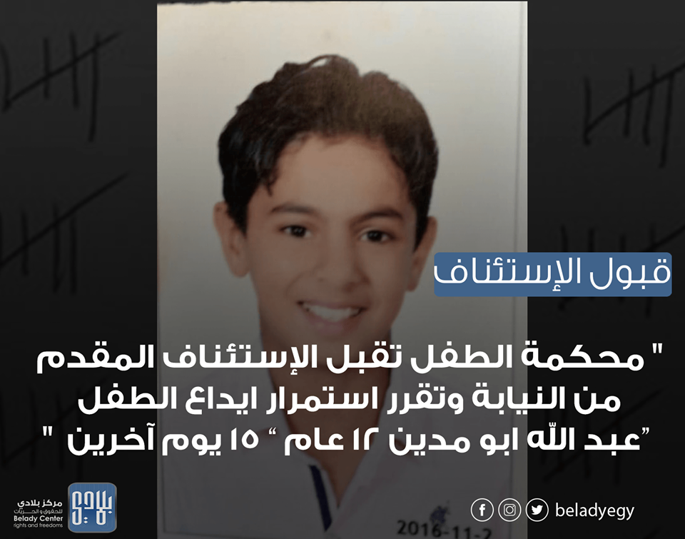 محكمة الطفل تقبل الإستئناف المقدم من النيابة بخصوص تسليم الطفل ” عبد الله ابو مدين ” لذوية وتقرر استمرار ايداع الطفل “عبد الله ابو مدين” 12 عام 15 يوم آخرين بقسم الأزبكية