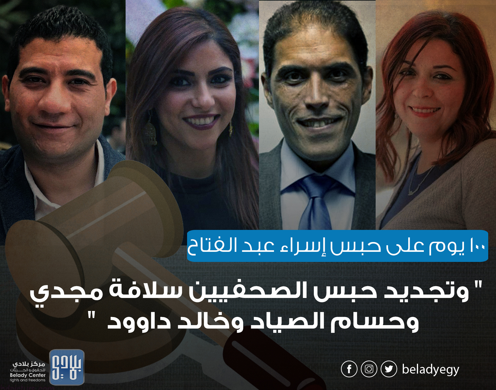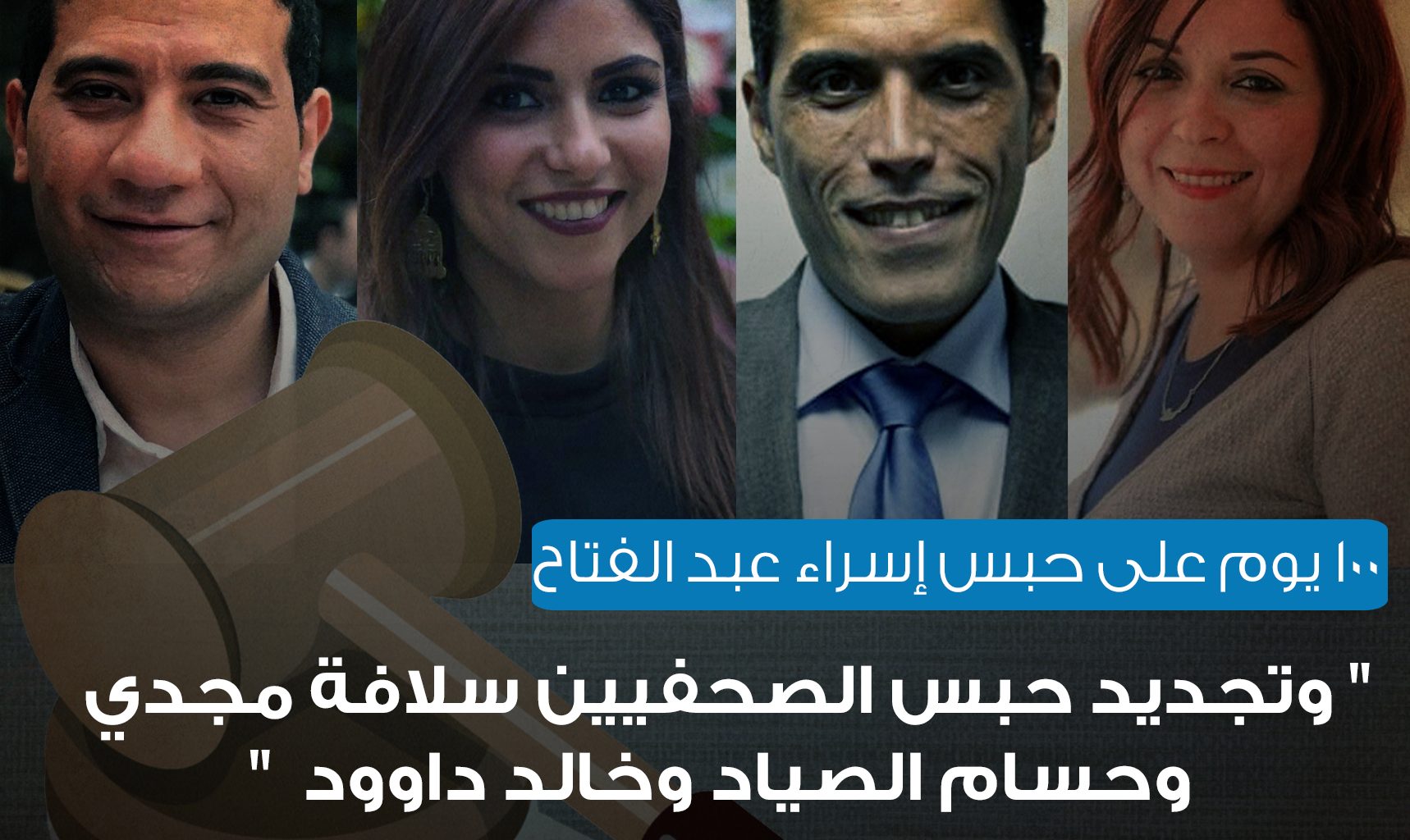 100 يوم على حبس إسراء عبد الفتاح، وتجديد حبس الصحفيين سلافة مجدي وحسام الصياد وخالد داوود منظمات حقوقية: نطالب بحفظ القضية 488 والإفراج الفوري عن جميع المتهمين فيها