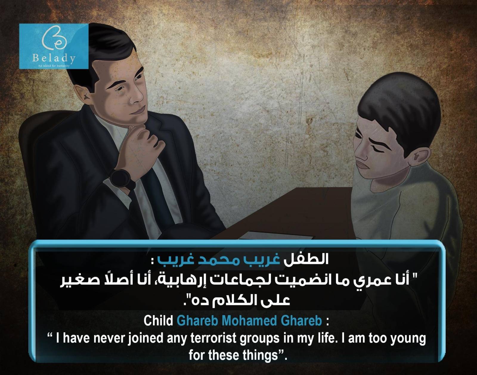 Child Ghareb Mohamed Ghareb : “ I have never joined any terrorist groups in my life. I am too young for these things”. الطفل غريب محمد غريب : ” أنا عمري ما انضميت لجماعات إرهابية، أنا أصلاً صغير على الكلام ده”.
