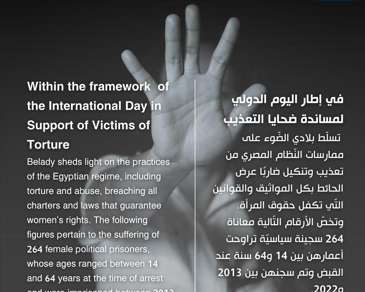 في إطار اليوم الدولي لمساندة ضحايا التعذيب، تسلّط بلادي الضّوء على ممارسات النّظام المصري من تعذيب وتنكيل ضاربًا عرض الحائط بكل المواثيق والقوانين التّي تكفل حقوق المرأة. وتخصّ الأرقام التّالية معاناة 264 سجينة سياسيّة تراوحت أعمارهن بين 14 و64 سنة عند القبض وتم سجنهن بين 2013 و2022.