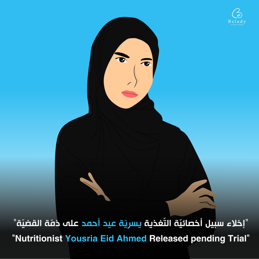 أخلت نيابة أمن الدّولة العليا سبيل أخصائية التّغذية يسريّة عيد أحمد عبد البر، البالغة من العمر 48 عام على ذمّة القضيّة رقم 1893 لسنة 2022 حصر أمن الدّولة العليا.