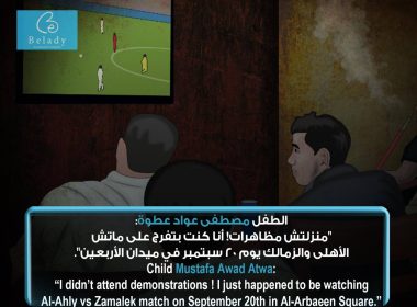 Child Mustafa Awad Atwa: “I didn’t attend demonstrations ! I just happened to be watching Al-Ahly vs Zamalek match on September 20th in Al-Arbaeen Square.”