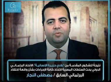 نتيجةً للشكوى المقدمة من “بلادي جزيرة الإنسانية” الاتحاد البرلماني الدولي يحث السلطات المصرية لاتخاذ كافة الإجراءات بشأن واقعة إختفاء البرلماني السابق / مصطفى النجار