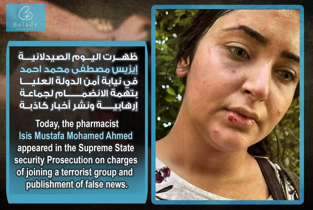 Today, the pharmacist / Isis Mustafa Mohamed Ahmed appeared before the Supreme State Security Prosecution and was investigated under the charges of joining a terrorist group and publishment of false news. The prosecution decided to imprison her under Case No. 2214 of 2021- Supreme State Security.